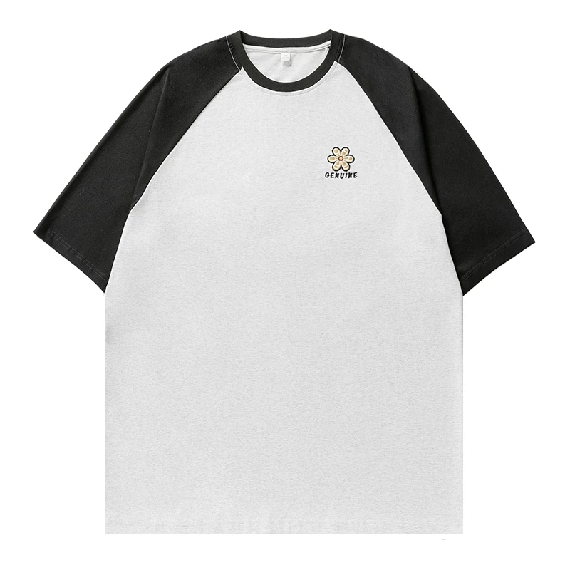 A trendy oversize raglan T-shirt with black sleeves and a white body, decorated with a small flower graphic and “GENUINE” text on the chest. Perfect for a casual and playful streetwear style.